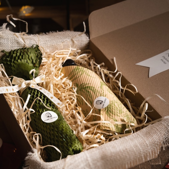 Pakujemy ten zestaw w tekturowe pudełko fasonowe, w naturalnym kolorze oraz wypełniamy drzewnymi trocinami. Taką paczkę wkładamy w kolejne pudełko (z recyklingu), żeby całkiem bezpiecznie dotarła do nadawcy.